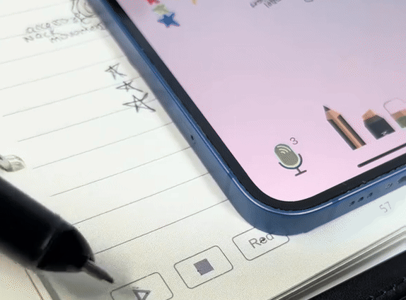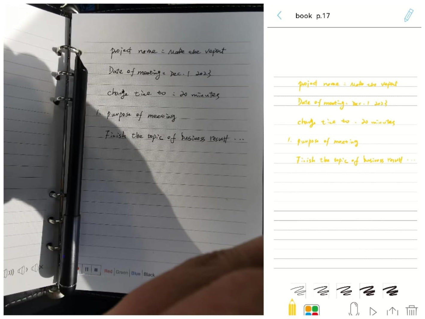 INKPENSYNC 전용 종이에 필기하면 펜이 움직임을 인식해 앱 화면에 동시에 표시됩니다.